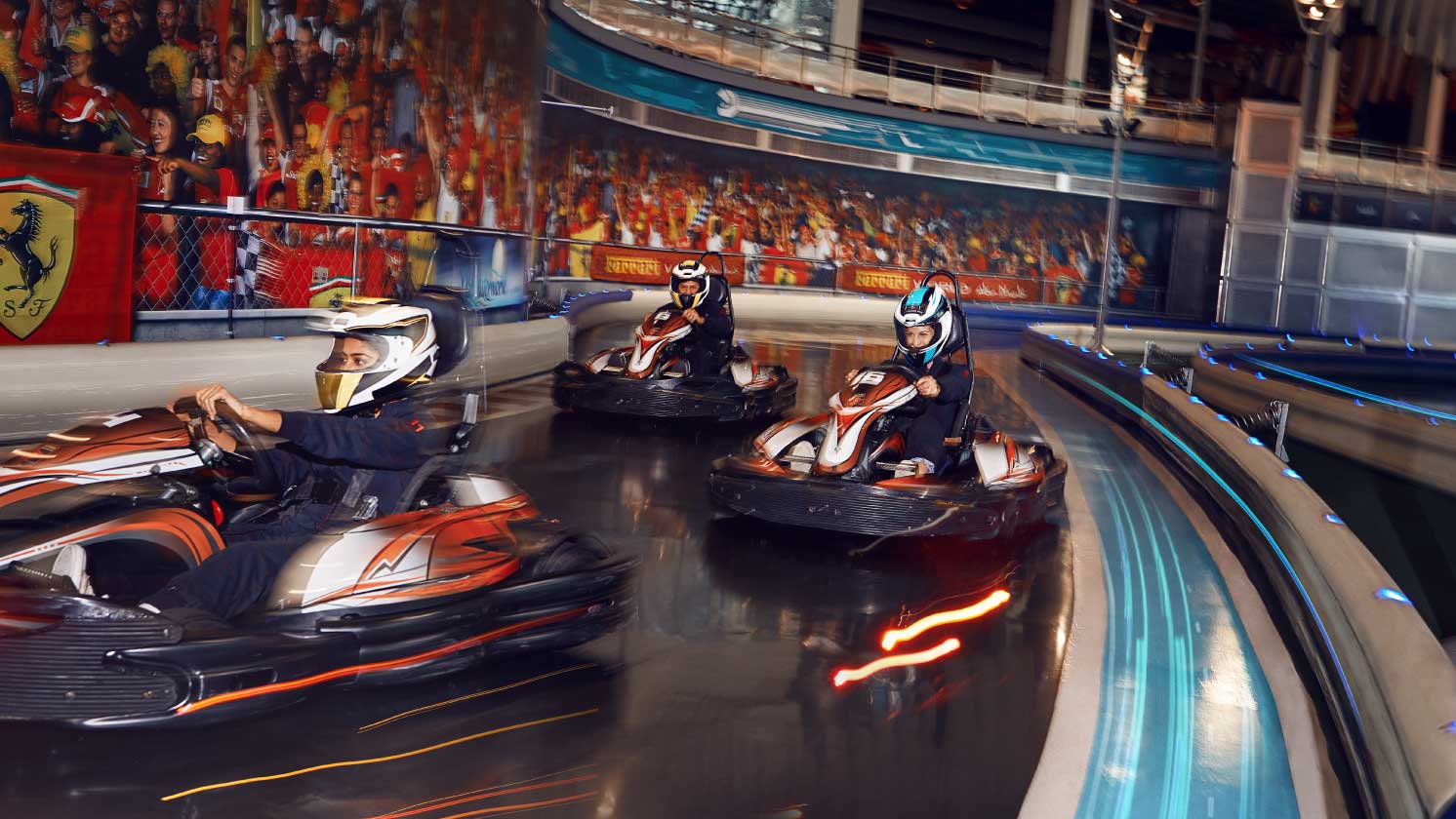 Karting Academy. Gear up with a full-face helmet, strap into an electric go-kart, and get ready to zoom when the track attendant gives the signal. Burn some rubber while keeping your ride under control as you zoom through the circuitous course of Ferrari World’s 290-meter-long go-karting track.
