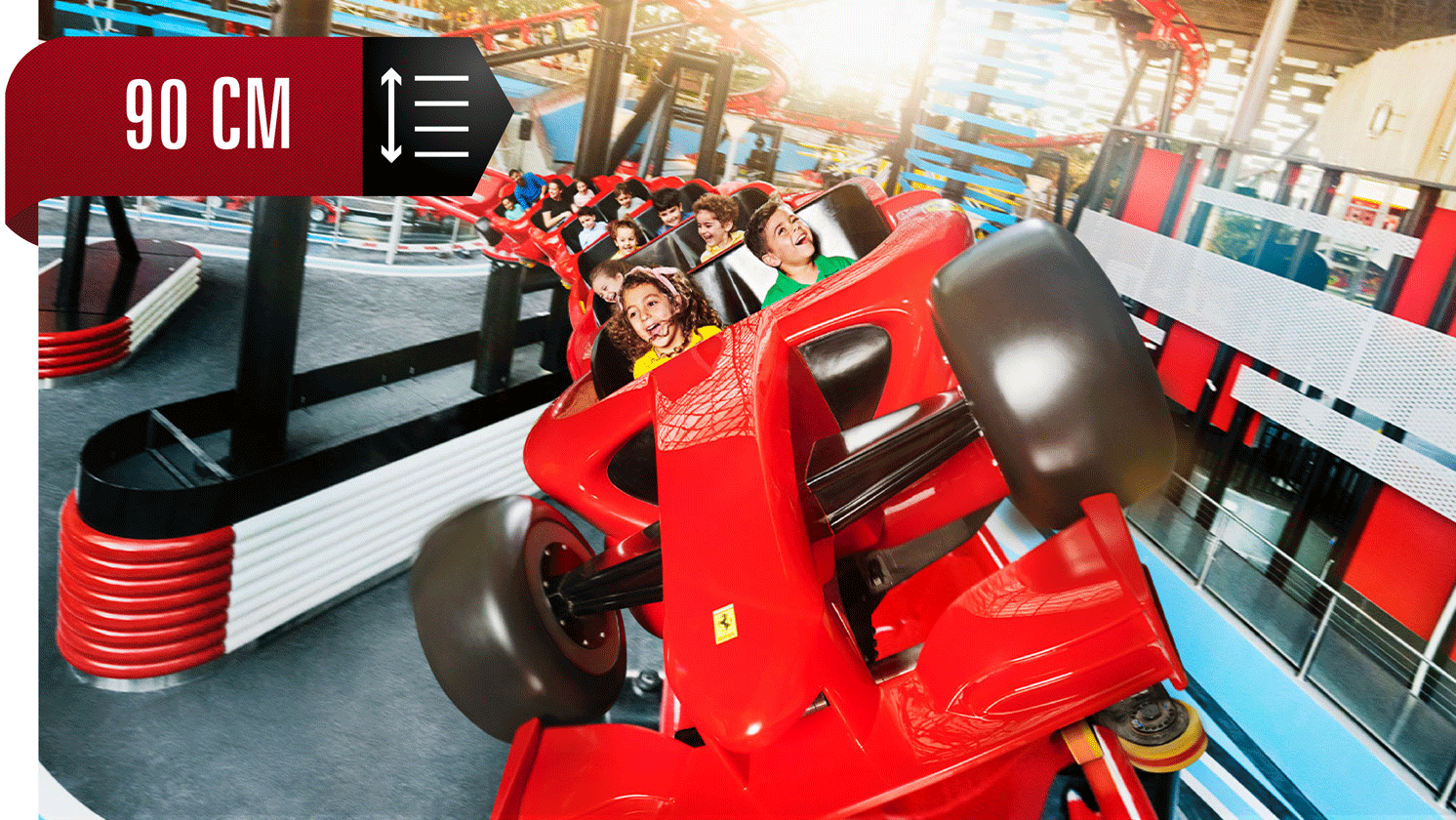 Formula Rossa Junior is a roller coaster for kids. It mimics the track of Formula Rossa but runs at a kid-friendlier speed of 45 kilometers per hour (27.96 miles per hour) instead of the 240 kph (149.13 mph) speed of its senior version.